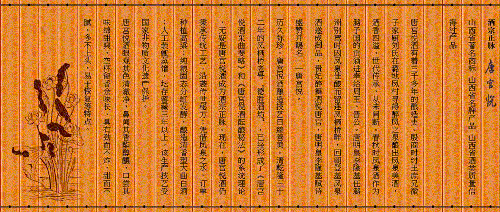 鳳棲橋釀業(yè)有限公司歷史悠久。從殷商微子家廚劉氏尋鳳泉釀酒至今,已有三千多年釀造史。劉氏后裔代傳代善, 才有唐明皇李隆基賜名“唐宮悅”,到清乾隆三十二年的鳳棲橋老號“德勝酒坊”已形成了《唐宮悅酒采曲要略》和《唐宮悅酒醞釀秘法》的系統(tǒng)理論的系統(tǒng)理論,直至建國初期的一九五二年才被當(dāng)時的潞城邊區(qū)酒坊所接管,一九七四年改邊區(qū)酒坊成立國營潞城縣酒廠,二00六年改制為現(xiàn)公司公司地處晉冀豫三省通衢素有“商賈云集旱馬頭”美譽的微子古鎮(zhèn)……【詳細